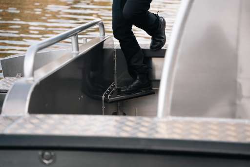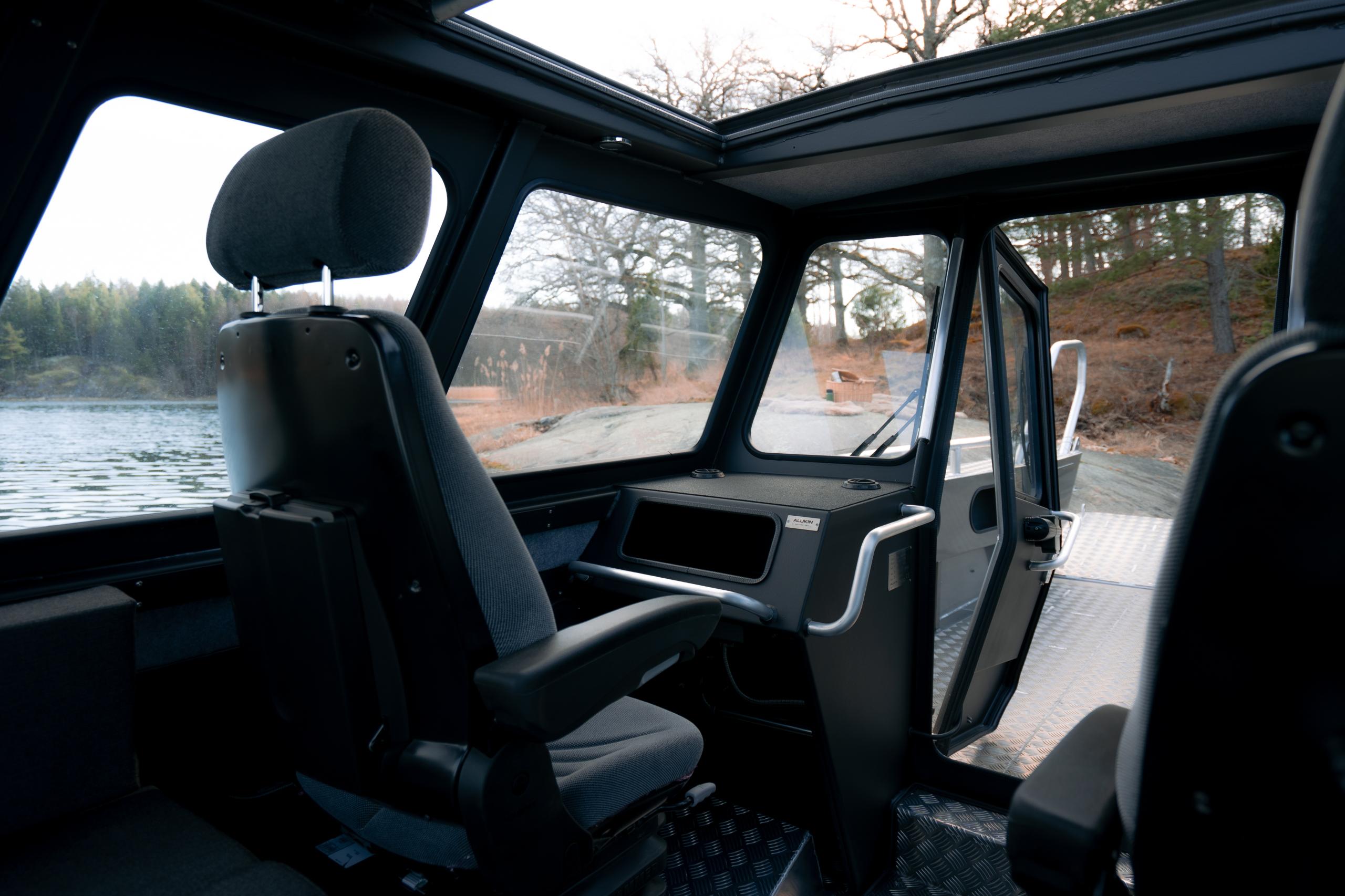 The spacious cabin has been designed to give you the best visibility possible. Full doors in both the front and the back make for easy access. The flap is operated from the driver's seat. The bow deck has an impressive length of 2.5 meters. The width of the flap opening is 1,28 m, providing plenty of space to bring an ATV on board. The height inside the cabin is 190 cm. ALUKIN CW 750 is the perfect aluminium boat to use all year round!